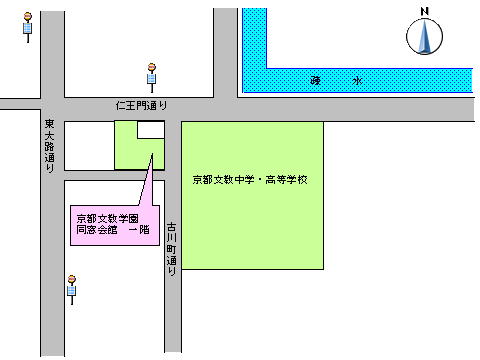 京都文教高等学校正門西側道路(古川町通り)を挟んだ同窓会館一階千久作会室(研修室)にて活動しています。
