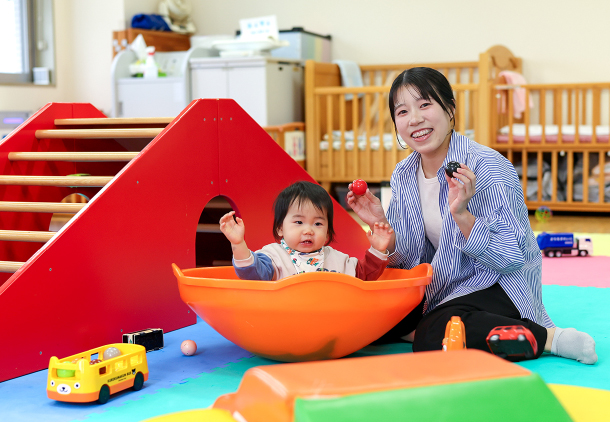 こども教育学科では、保育士資格と幼稚園教諭一種免許状の2つの資格を取得できるので、保育園と幼稚園の機能をあわせもつ「認定こども園」での活躍の場も広がります。また、京都文教大学のキャンパスには、地域の親子のための「子育て支援室」があり、学生たちも利用者の方々と交流できる機会が豊富にあることも大きなポイントです。