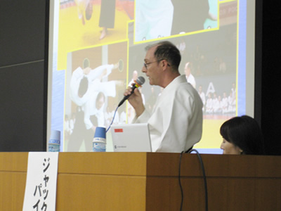 フランス出身で合気道道場「無限塾」を主宰するジャック・パイエ先生をお迎えし、「和の武道」としての合気道の歴史や思想についてお話いただき、そして演武の実演も見せていただきました。1920年代に始まった現代武道としての合気道は、「敵を倒す道ではなく、世界を平和に導く道」としての思想をもち、相手に嫌な思いをさせずに、相手の力を利用し、関節技、押さえ技などで攻撃をかわすという護身術であることが解説されました。実演でパイエ先生は3名のお弟子さんを相手に、「自分の気持ちと相手の気持ちを一体にさせ、重心、姿勢や呼吸を大事にして、自然に相手のバランスを崩していく」ことを解説しながら、無理に力をかけることなく次々と技をかけていかれました。本学の卒業生であり、今回のシンポジウムのコーディネート役およびコメンテーターを務めていただいた三野田加寿実先生は臨床心理士の立場から「パイエ先生が合気道で仰ることは、臨床心理の現場でも大切にしたいことに通じています。相手をどうこうしようというのではなく、相手の気に合わせて何ができるか、どうすればプラスに動いてくれるか、という基本姿勢が共通していると思えます」と述べられました。
