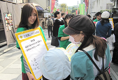学生が宇治茶の歴史や文化、味の違いを学び、そこで感じた魅力を広く地域に発信するプロジェクト。宇治の商店街と連携し、お茶の知識を学べる「宇治茶スタンプラリー」や老舗茶舗のお茶を飲み比べることができる「聞き茶巡り」を毎年実施しているほか、宇治茶の美味しさを伝えるさまざまな活動に精力的に取り組んでいる。学生たちは、お茶を通じて観光客や地域の方々との交流を深め、地域活性化をめざして全力を注いでいる。