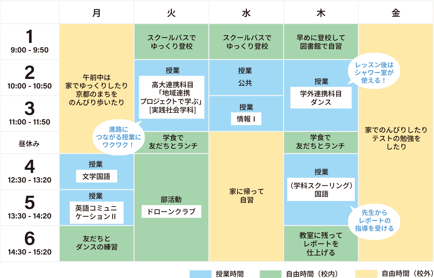 入学式/卒業式/ガイダンス(履修登録・レポート提出など)/健康診断/学習会(進路学習・人権学習・防災研修)/HR(ホームルーム)/校外学習(動物園・植物園・水族館 など)/修学旅行 など