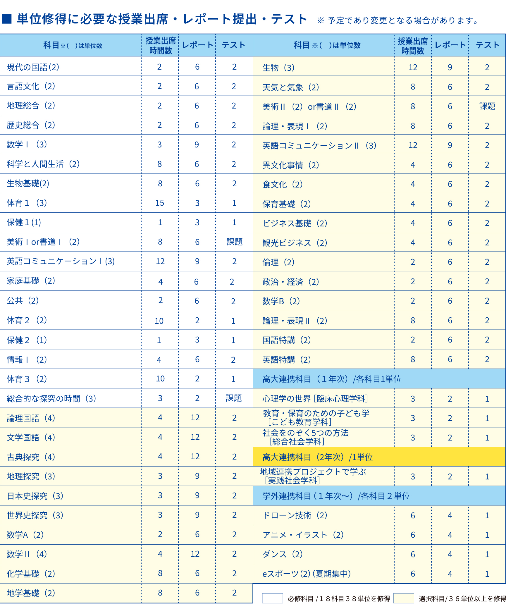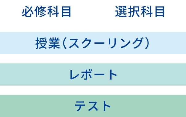 科目ごとに教室で受ける授業です。各科目ごとに決められている最低出席回数以上の出席が必要です。